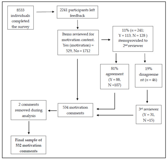 To corroborate the content analysis conducted, a randomly generated subsample of 241 responses (11%) was provided to co-author (N.A.C.) for content analysis. There was an 81% agreement between authors, indicating good interrater reliability [27]. For the 19% of responses where agreement was not reached, a third researcher (A.N.) undertook independent coding to resolve discrepancies. A sample of 534 motivation comments were included for analysis, although two comments were recategorized as not motivation during the coding phase (with agreement from authors N.A.C. and L.M.). The final sample included 532 motivation comments (Figure 1).