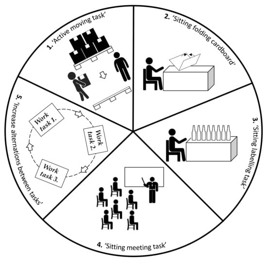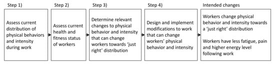 Lerche, A.F.; Mathiassen, S.E.; Rasmussen, C.L.; Straker, L.; Søgaard, K.; Holtermann, A. Development and Implementation of ‘Just Right’ Physical Behavior in Industrial Work Based on the Goldilocks Work Principle—A Feasibility Study. Int. J. Environ. Res. Public Health 2021, 18, 4707. https://doi.org/10.3390/ijerph18094707