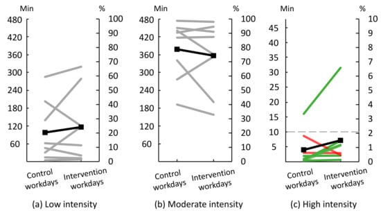 | Moderate intensity (≥25–<60%HRR) | 378 (79) min | 79 |