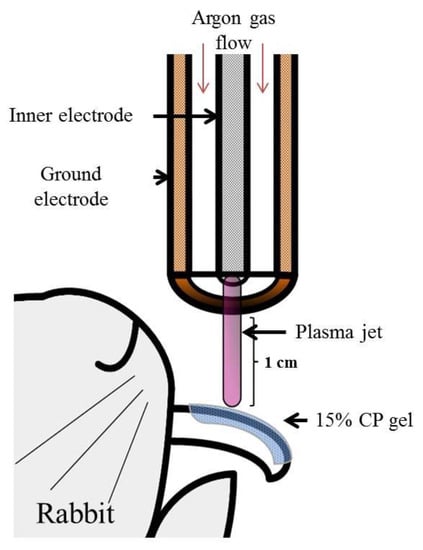 A schematic of the NAPP device was developed (Figure 1). The plasma generating module of the inner stainless and outer copper electrode was made of a ceramic body as a dielectric. The outer electrode is grounded, and a sinusoidal high voltage is applied to the inner electrodes by a high voltage source, which can increase the voltage up to 10 kV with a frequency of 15 kHz. Over 2.8 kHz can generate the plasma in an alumina tube when argon was sued as buffer gas at a low rate of 2 standard liters per minute. The temperature of the NAPP flow at 1 cm from the electrode end was maintained around 35 °C for 10 min [,,,,,]. The distance of treating subjects from the electrodes was kept at 1 cm.