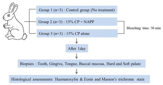 Nine New Zealand adult female rabbits, older than six months and ranging in weight from 2.5 to 3.5 kg, were used in this study. Animals were housed individually in separate rabbit cages at the ambient temperature of 20 °C and a 12/12-h light/dark cycle. Animals had free access to drinking water and standard laboratory pellets. At the time of the study, there were no clinical signs of disease in any animal. The protocol was reviewed and approved by the Pusan National University Institutional Animal Care and Use Committee (PNU-IACUC), Pusan, Korea, in 2012 (approval 2012-0086). The overall experimental design of this study is depicted in Figure 2. All rabbits were subjected to general anesthesia, performed with an intramuscular 5:1 mixture of ketamine HCl (50 mg/kg, Ketalasr®, Yuhan, Korea) and xylazine (10 mg/kg, Rumpun®, Bayer, Korea), and operated on under sterile conditions prior to the bleaching procedure. The nine animals were then randomly divided into three groups of three animals each, according to the treatment. Group 1, the control group, was not treated. Group 2 was treated with NAPP in combination with 15% CP (Kool white 15%, Pac-dent International, Walnut, CA, USA). A uniform 1 mm-thick layer of 15% CP was applied over the labial surface of the upper incisor teeth. During NAPP exposure, the NAPP tip was positioned approximately 1 cm away from the enamel surface. Group 3 was treated with 15% CP without NAPP and left undisturbed. After the 30-min bleaching treatment, the gel was gently wiped with sterile gauze.