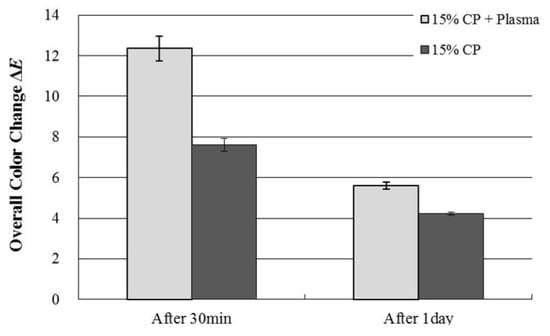 The mean ΔE values using colorimeter were shown in Figure 3. The mean ΔE± standard deviations (S.D) were 12.36 ± 0.61 and 7.61 ± 0.32 after 30 min treatment with plasma and without plasma, respectively. After 24 h, the mean values of ΔE ± SD were 5.60 ± 0.17, and 4.23 ± 0.08 after 1 day of treatment with plasma and without plasma, respectively. An improvement of tooth color was observed at the application of NAPP.