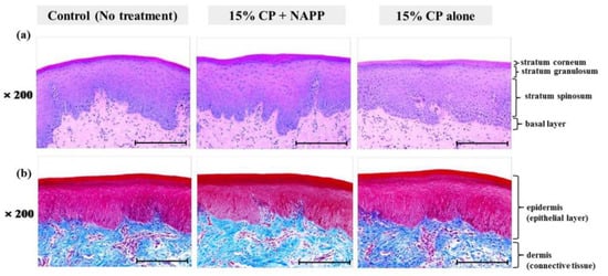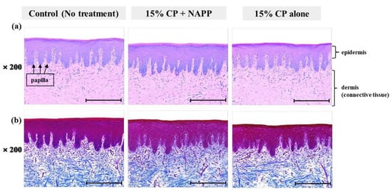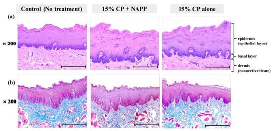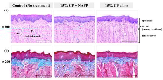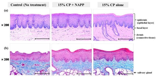 Our previous study has shown that NAPP increased the production of ∙OH radicals and yielded a much better bleaching effect than that of conventional light sources [,,,], while the tooth temperature was maintained near the body temperature []. Furthermore, tooth bleaching with NAPP did not affect the microhardness and mineral content of the tooth []. The histological investigation of oral tissues after NAPP treatment is essential for its safe utilization. The 15% CP is used for home bleaching and contains a relatively low HP concentration of 5.4%. Llena et al. [] reported that CP had a less cytotoxic effect on the human dental pulp stem cells than other products. In our previous paper, the bleaching effect of 15% CP itself was insignificant, but the combination treatment of plasma with 15% CP showed similar results to the bleaching effect of 30% HP [,]. The procedure of home bleaching using 15% CP takes a long time to achieve a bleaching effect, but the pain complaints of the operator are relatively small. Therefore, NAPP treatment could reduce the time required for the bleaching effect of 15% CP without the injury to the teeth. However, the histological safety of NAPP has not been fully demonstrated in oral soft tissues such as gingiva, tongue, buccal mucosa, and hard and soft palates. If there is an energy source that effectively induces the tooth color change without causing tissue damages, it would be a useful device for tooth bleaching in clinical practice. The aim of this study was to evaluate the histological changes in the oral soft tissues treated with NAPP and 15% CP to prove that NAPP is safe as well as effective.
