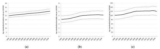 Time trends in (a) age-standardized incidence rates, (b) age-standardized mortality rates, and (c) age-standardized DALYs rates of CKD from 1990–2019. Dashed lines show the 95% uncertainty intervals.