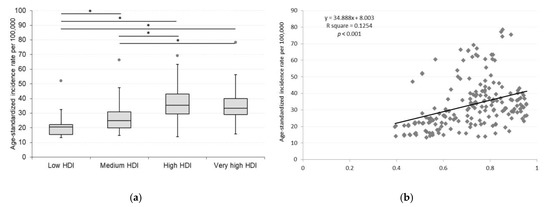 In this study, we investigated the trends and variations of incidence, mortality, and disease burden of chronic kidney disease due to T2DM globally. In order to provide a more detailed assessment across countries, we used age-standardized measures for national comparison, according to socioeconomic development levels expressed in HDI. The HDI, which is a standard socioeconomic indicator, summarizes the three key dimensions of human development (life expectancy at birth, mean and expected years of education, and GNI per capita) [16] and allows comparison across countries by different levels of human development. Socioeconomic indicators were also used by others to express the relationship between socioeconomic determinants and national disease burdens [21,22,23].