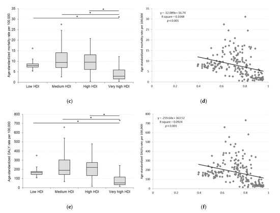The distribution of age-standardized rates of CKD according to HDI groups in 2019 is presented in Figure 1a–c. Of the original 204 countries, the HDI data was available for 187 countries in 2019, including 33 low, 37 medium, 53 high, and 64 very high HDI countries. The age-standardized incidence, mortality, and DALYs rates of CKD varied significantly across countries with different human development levels according to the Kruskal–Wallis test (p = 0.001). According to pairwise comparison, ASIR in low HDI countries differed significantly from medium (p = 0.007), high (p < 0.001) and very high (p < 0.001) HDI countries. In the case of ASMR and age-standardized DALYs rates, only very high HDI countries showed a significant difference from low (p < 0.001), medium (p < 0.001), and high HDI countries (p < 0.001). (Figure 2a,c,e) We observed a positive relationship between the ASIR and HDI values (p < 0.001). The countries with a higher level of social development are experienced higher incidence. In contrast, negative association was determined between ASMR (p < 0.001) and DALYs rates (p < 0.001) and HDI values. (Figure 2b,d,f).
