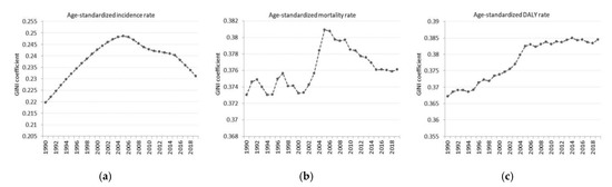 Trends in the Gini coefficients calculated based on (a) age-standardized incidence rates, (b) age-standardized mortality rates, and (c) age-standardized DALY rates across 204 countries globally between 1990 and 2019.