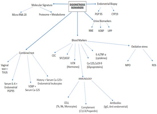 Endometriosis is a complex disorder, which is still not fully comprehendible. Recently, various potential pathomechanisms were considered, such as the regurgitation of menstrual blood, chronic inflammatory milieu, coelomic metastasis, and so forth. This particularly complex disorder comprises of many factors that can participate in the progression of all pathologies, such as hormones, cytokines, angiogenic factors, and other specific glycoproteins. Some of these theoretical constituents could be proposed as endometriosis biomarkers. Figure 1 depicts various differential biomarkers found largely, but not exclusively, in the blood, which have been investigated during the last decade, including apoptotic markers, cell adhesion molecules, and other matrix-related proteins. All of these molecules are involved in a specific, indispensable process during the pathogenesis of endometriosis. Beyond the aforementioned molecules, CA 125, CA 19-9, urocortin, and IL-6 have also been taken as areas of interest as promising, non-invasive biomarkers for early endometriosis. Unfortunately, however, many of these newly revealed markers, which could be taken as indicators of endometriosis, are far from meeting certain criteria for non-invasive diagnosis [6,7,8,9] (Figure 1).