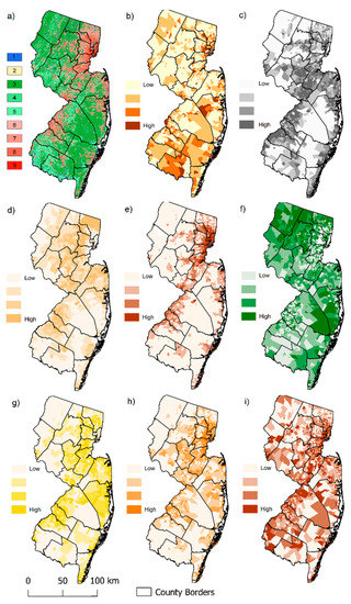 Land cover classification and landscape characteristics of New Jersey: (a) Reclassified land cover classification (1 = Water, 2 = Sand/Bare, 3 = Forest, 4 = Shrubs, 5 = Grass, 6 = Open, 7 = Low, 8 = Medium, 9 = High intensity developed lands); (b) Census tract poverty level by categories (0–5%, 5–10%, 10–20%, 20+%); (c) Shannon Diversity Index (SHDI) by quartiles low to high; (d) Proportion of open developed lands by quartiles low to high; (e) Proportion of high-intensity developed lands by quartiles, low to high; (f) Forest contiguity index by quartiles, low to high; (g) Aggregation index (AI) of open developed lands by quartiles, low to high; (h) Aggregation index (AI) of medium-intensity developed lands by quartiles, low to high; (i) Aggregation index (AI) of high-intensity developed lands by quartiles, low to high.