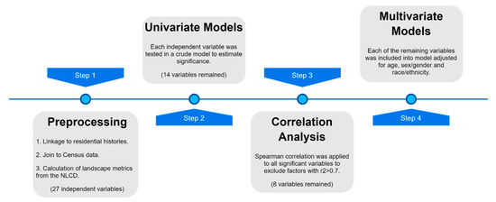 We designed a process for variable selection and evaluation with minor modifications based on methodology from a previous neighborhood wide association study or NWAS [80]. All methodological steps are summarized in Figure 2. First, we developed a series of univariate, crude models to estimate the effect of each selected landscape metric and other neighborhood variables on the duration of survival time using Cox proportional hazard regression for time-varying covariates [81]. Cox proportional hazard regression is a widely used semi-parametric time-to-event modeling technique, where death is considered being the event. Cox proportional hazard regression allows incorporation of individual and area-level covariates. Additionally, it does not require the definition of a probability distribution in advance, and is suitable for time-varying covariates [82]. Variables were selected if they reached significance at p < 0.05.