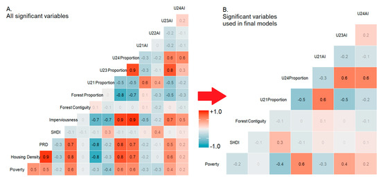 Correlation matrix before and after reduction of significant variables: (A) All significant variables based on the univariate models; (B) Reduced set of significant variables used in final multivariate models. (Note: Land cover classes are based on the reclassified NLCD raster: U21 = Open, U22 = Low, U23 = Medium, U24 = High intensity developed lands). AI = Aggregation Index, SHDI = Shannon Diversity Index, CI = Contiguity Index, PRD = Patch Richness Density.