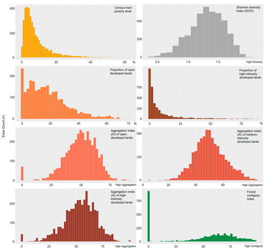 The distribution of colon cancer patients by neighborhood/landscape characteristics at the time of diagnosis showed that the majority of patients (73.9%, n = 2919) lived in areas with a poverty level of less than 10%. Additionally, most patients (82.5%, n = 3259) were living in neighborhoods with a relatively low (≤30%) proportion of open developed lands (areas with large greenspace cover), while 89.8% (n = 3547) of patients living in neighborhoods where more than 30% of the total landscape was dominated by high-intensity developed lands (less than 20% greenspaces). Twenty-four percent (n = 939) of all colon cancer patients were residents in a neighborhood with no tree cover. The distribution of the study population for these and other landscape metrics are summarized in Figure 4.