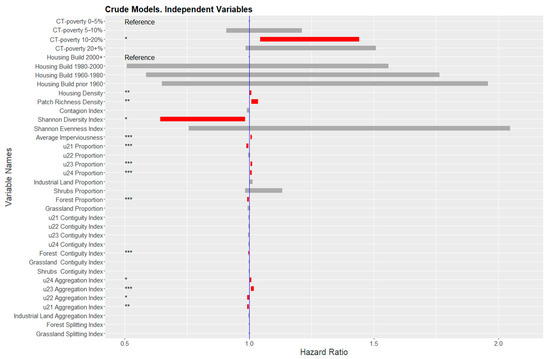 Hazard Ratios of neighborhood-level variables from the crude models, adjusted for each variable individually. Blue line indicates there is no difference in risk. Red bars indicate the 95% confidence interval of statistically significant variables. (Note: Significance levels <0.05 = *; <0.01 = **; <0.001 = *** Land cover classes are based on the reclassified NLCD raster. U21 = Open, U22 = Low, U23 = Medium, U24 = High intensity developed lands).