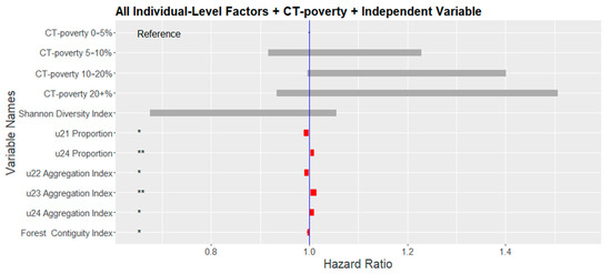 Hazard Ratios of neighborhood-level variables from the multivariate model adjusted for all individual-level factors and each neighborhood/landscape variable individually. Blue line indicates a zero-coefficient or no difference in risk. Red bars indicate the 95% confidence interval of statistically significant variables. (Note: Significance levels <0.05 = *; <0.01 = **; Land cover classes are based on the reclassified NLCD raster. U21 = Open, U22 = Low, U23 = Medium, U24 = High intensity developed lands).