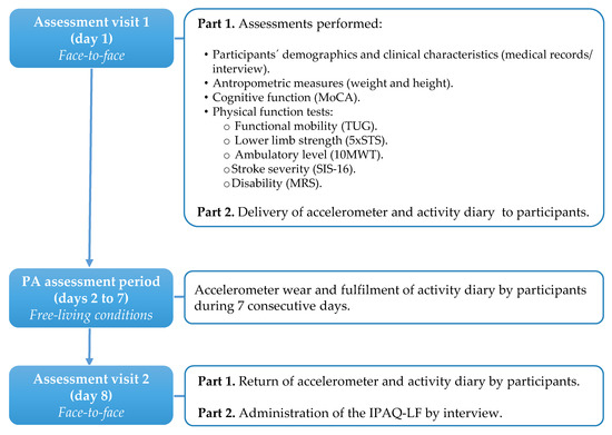 For the purposes of this study, two assessment visits were scheduled 8 days apart in the author’s University laboratory or at the community facility attended by participants (Figure 1). On the first visit, participants’ demographic and clinical characteristics were collected through medical records or by interview. Afterwards, weight and height were measured and cognitive function was assessed with the Montreal Cognitive Assessment (MoCA) [32]. Next, physical function tests were performed to assess: functional mobility with the timed up and go test (TUG) [33]; lower limb strength with the five times sit-to-stand test (5 × STS) [34]; ambulatory level with the 10-m walk test (10 MWT) [35]; stroke severity with the Stroke Impact Scale 16 (SIS-16) [36]; and disability with the Modified Rankin Scale (MRS) [37]. Before ending this session, participants were instructed to wear an accelerometer for at least 7 consecutive days and to keep an activity diary. On the second visit, participants returned the activity diary and accelerometer and subsequently completed the IPAQ-LF. This enabled comparative analysis between accelerometer data and IPAQ-LF data.