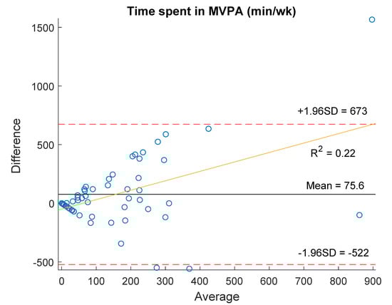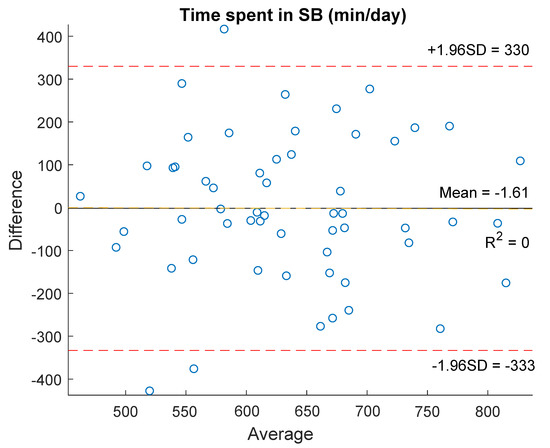 Regarding SB, the mean difference between the IPAQ-LF and the accelerometer data was −1.61 (169.2) min/day, although the LoA were wide (330.1 to −333.3 min/day, Figure 2c) and their percentage error was high (53.2%). In this case, our participants under-reported the time spent in SB when answering the IPAQ-LF. The BA plot indicated measurement bias and the regression analyses presented no significant linear trend (R2 = 0.00) between differences and mean values.