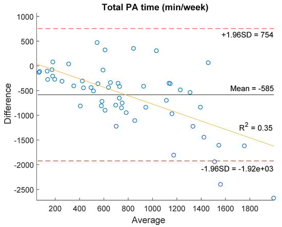 Results for the total PA time showed an average difference between IPAQ-LF and the accelerometer data of −585.2 (683.5) min/week, pointing to under-estimation of the reported total PA time in the IPAQ-LF. The LoA were wide (between 754.4 and −1924.8 min/week, Figure 2b) and their percentage error resulted in 127.7%. In the BA plot, the distribution of points on the scatterplot suggested proportional bias and the regression analysis showed a negative linear trend (R2 = −0.35) between the two methods differences and their average. In other words, the difference between IPAQ-LF-derived and accelerometer-measured total PA time decreased as the mean of the two methods increased.