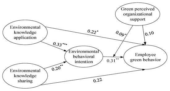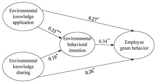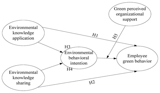 Environmental behavioral intention is considered as an individual’s perceived subjective in taking part in environmental behavior, which implies his or her disposition in performing that environmental behavior [40]. Environmental knowledge application implies employees with environmental awareness possess a sense of duty or concern for environmental consequences. Through the effect of environmental behavioral intention, employees’ personal disposition and moral obligation are activated and they become passionate about environmental protection, thus, they are more willing to act with green behavior.
