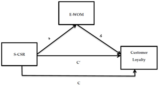 Proposed research model where corporate social responsibility through social media (S–CSR) = the independent variable, customer loyalty = the dependent variable, electronic word of mouth (E-WOM) = the mediating variable, C′ = indirect direct effect of X on Y with the effect of the mediator, and C = direct effect of X on Y without a mediator. a= direct path from S-CSR to E-WOM and b = direct path from E-WOM to customer loyalty.