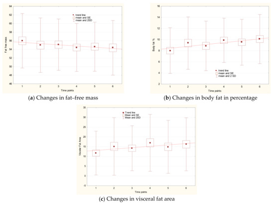 Changes in fat– free mass content (a), percentage of body fat (b), and visceral fat area (c) with respect to time points.