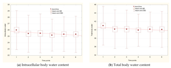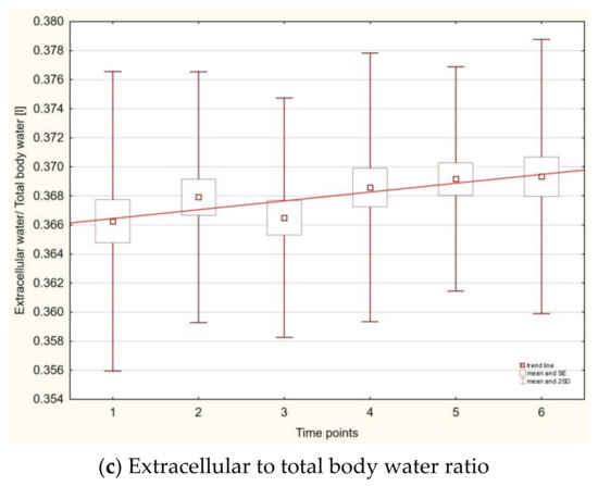 The total body water decreased for water parameters, ICW and TBW, whereas the parameter of ECW to TBW increased, with statistically significant differences (between the first and the last time point) of p1–6 < 0.005, p1–6 < 0.011, and p1–6 = 0.001, respectively (Figure 2a–c).