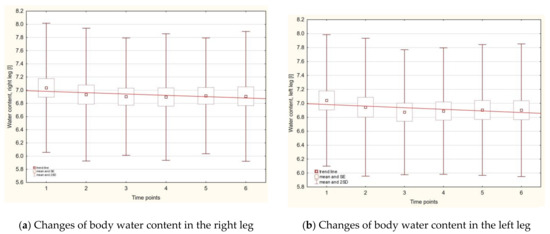 Statistically significant changes in the parameter of water content were for both legs, between first and last measurements: p1–6 < 0.002 for right leg and p1–6 < 0.017 for the left leg (Figure 3a,b).