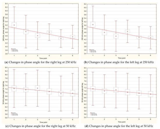 Fluctuation in PhA values for 5, 50, and 250 kHz was observed between time points. Regardless of frequency, the highest value of PhA was for a trunk. Higher frequency was related with higher PhA values for all compartments. For both the lower limbs, the highest values of PhA were observed when using a frequency of 50 kHz, and the lowest when using 5 kHz. For all the time points, the PhA values measured with a frequency of 5 kHz for the right side of the body (arms and legs) were slightly higher than those for the left side. The highest PhA values for all body compartments (including the trunk) were noted in the third time point, that is, the end of August 2016. For a frequency of 50 kHz between each time point, substantial differences were noticed, but when comparing the starting time point and the last measurement, the differences were only observed for the right arm and the right leg. For the highest frequency (250 kHz), all body compartments had the highest PhA values in the first time point, and for subsequent time points the PhA values were dropping. For both legs, 250 kHz and 50kHz were dropping systematically, as depicted in Figure 4a–d.