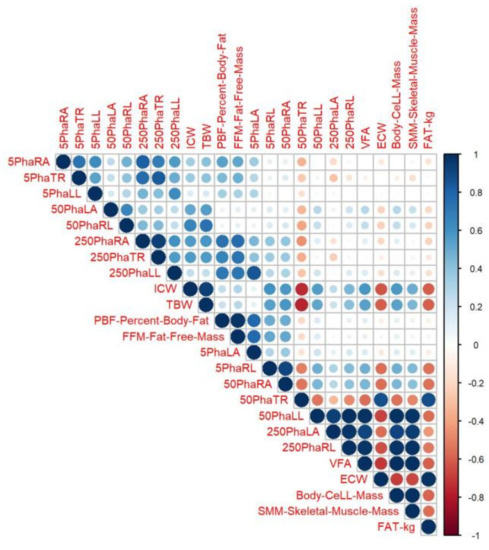Significant correlation between PhA values and body parameters with regard to fat tissue and PhA values of the legs was noticed when PhA was measured at 50 kHz. A higher VFA parameter meant a lower PhA value for both legs (r > −0.75), and PhA values for the legs inversely correlated with body fat (r = −0.63 and r = −0.61; for the right and the left leg, respectively). The results of the correlation analysis are shown in Figure 5.