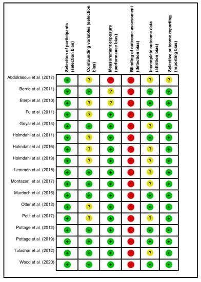 The quality of the 17 selected studies was assessed, and the results are summarized in Figure 2. All the studies were of high risk for detection bias concerning blinding toward the outcome of pathogen assessment as the samples were not anonymized when sent for pathogen assessment. One study presented with an unclear risk for incomplete data representation or outlier results being present []. Confounding variables for selection bias was of unknown risk for eight of the articles [,,,,,,,]. Incomplete data presentation leading to attrition bias or at least the risk of misinterpretation of the log loss of viruses were not determined due to the various steps of virus remuneration after VHP exposure [,,,,,,,,,,].