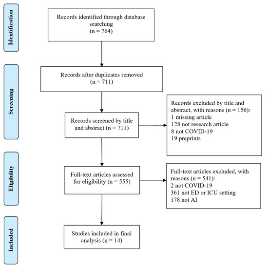 Our search of the six databases returned 764 studies, of which 14 were included and analysed in this review (Figure 1). Table 1 presents the main characteristics of the study. Eleven of the 14 studies investigated predictive models and were assessed according to PROBAST and TRIPOD: eight studies developed prognostic models [30,31,32,33,34,35,36,37] and three studies developed diagnostic models [38,39,40]. Of the remaining three studies, two evaluated the prognostic potential of existing AI-based lung segmentation software (without integration into a multivariate predictive model) [41,42] and one investigated an AI-based system for resource optimisation in the ICU [43]. Eleven studies used patient data collected from the ICU and four studies used data from the ED. No study collected data from the prehospital setting, despite including prehospital-related search terms in the search strategy.