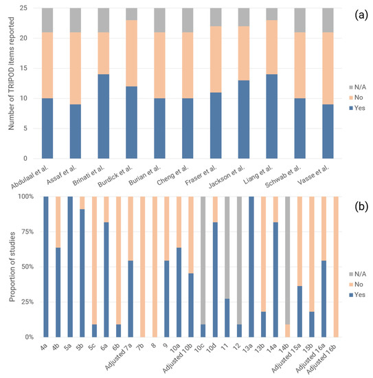(a) Number of TRIPOD items reported per study and (b) Proportion of studies reporting on each TRIPOD item.
