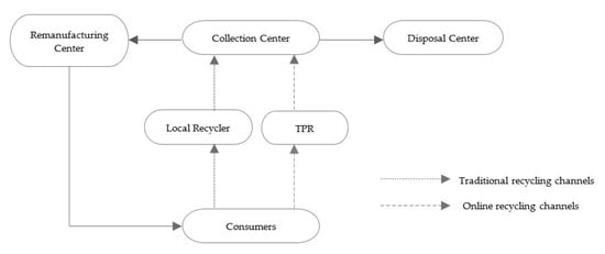 We assume that the online recycling platform is established by third-party recyclers (TPR), which is currently the main mode of constructing such platforms in China, accounting for about 80% of the total number. Some manufacturers, while recycling e-waste through existing channels, such as offline stores and official websites, also entrust online recycling platforms to recycle. For example, in China, Meizu Inc. recycle used phones through its self-built “mCycle” recycling project and cooperate with “ihuigo network” (http://www.ihuigo.com, accessed on 3 August 2017) for recycling; Huawei Inc. carries out part-exchange activities and recycles in cooperation with “huishoubao network” (http://www.huishoubao.com, accessed on 17 August 2016). Such a new mode can reduce the cost of self-built, and outsourcing services can also improve service quality.