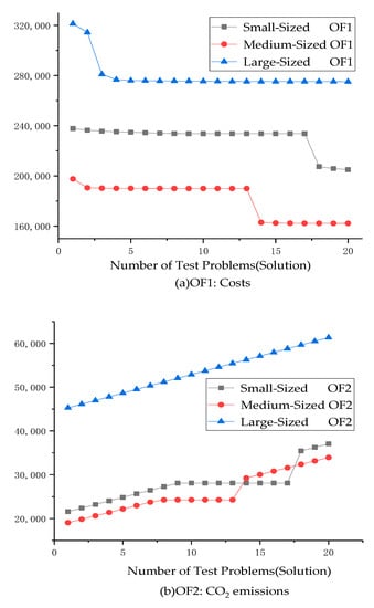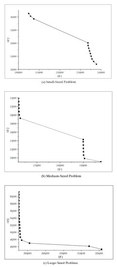 In Figure 7 it is shown that, as the size of test problems increases and the number of test problems increases, there is no large-scale oscillation in the value of the first objective function; only a small decrease trend occurs in all three sizes of instances. Next, it also appears that the second objective function is increased in all three sizes of instances.