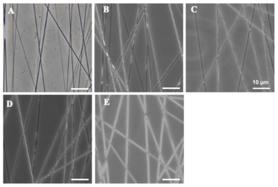 Phase-contrast images showing fabricated PCL/GT nanofibers at different ratio (A) 100:0, (B) 70:30, (C) 50:50, (D) 30:70, (E) 0:100.