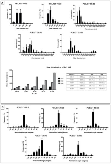 (A) The diameter and size distribution of PCL/GT nanofibers. Note that increasing GT concentration will increase the fiber diameter. (B) The fiber alignment of PCL/GT nanofibers. All nanofibers were relatively aligned, as indicated at the 0° normalized angle.