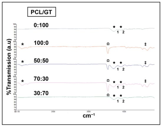 FTIR spectra of PCL/GT nanofibers. Blended composite PCL and GT contained both polymer’s spectrum as indicated by the distinctive peaks. * H-C-H stretching, Ω carbonyl (C=O) stretching, ‡ C-O-C stretching indicates PCL presence. ★ Common bands of protein (indicates the presence of GT); 1. C-O stretching, 2. N-H and C-N (peptide bond) stretching.