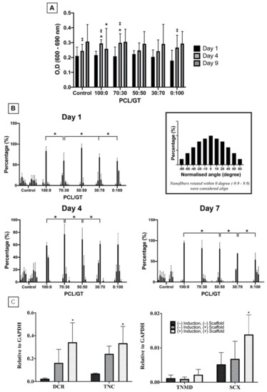 (A) Viability of WJ-MSCs cultured on PCL/GT nanofibers. Overall, WJ-MSCs were viable for 7 days in culture with PCL/GT nanofibers. Two-way ANOVA with post-hoc Tukey or Dunnett’s test was used for analysis. ‡ p-value (<0.05) compared to day 1 within each group. * p-value (<0.05) compared to control within each day (1, 4 and 9). (B) Alignment of WJ-MSCs on PCL/GT nanofibers. * p-value (<0.05). (C) Tenogenic gene expression of WJ-MSC in culture with PCL/GT nanofibers that includes decorin (DCR), tenascin-C (TNC), scleraxis (SCX) and tenomodulin (TNMD).