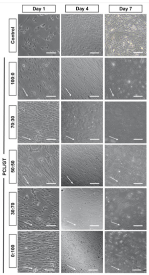 The alignment of WJ-MSCs on PCL/GT nanofibers. Note that WJ-MSCs on PCL/GT 0:100 started to lose their orientation as the nanofibers were degraded following days in culture. (Scale bar represents 100 µm, arrow indicates the direction of cell alignment).