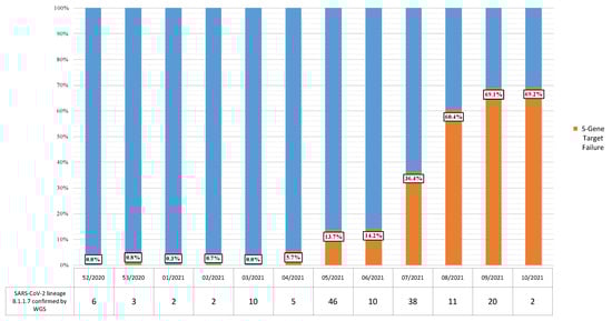 VOC 202012/01 showed an increased estimated transmissibility of up to 70% []. A recent study by Davies et al. estimated the overall hazard of death associated with B.1.1.7-lineage SARS-CoV-2 infection as 61% or higher, suggesting that this VOC is not only associated with greater transmissibility but also with more severe illness []. At the time of writing, the B.1.1.7 variant has been detected in all EU/EEA countries that have any significant detection capability []. In Italy, a flash survey conducted in February 2021 suggested that the prevalence of this variant increased from 17.8% to 54.0% in 2 weeks, increasing to 86.7% in March 2021 [,]. VOC 202012/01 is characterized by 14 genetic mutations, eight of which are located in the portion of the genome encoding the spike protein []. One of the characteristic mutations is the Δ69/70 deletion, which impairs the detection of the S gene using common commercial real-time PCR kits. In the UK, Israel, and Portugal, a strong association between this S gene target failure (SGTF) and the circulation of the B.1.1.7 variant was reported [,,,]. This association could vary in other countries because other variants could also produce S gene-negative results. Due to its high prevalence in the UK, SGTF has been used as a proxy to track the circulation of B.1.1.7-lineage VOC []. In the Apulia region (southern Italy), VOC 202012/01 was first identified at the end of December 2020 []. In three flash surveys conducted to estimate the prevalence of VOC 202012/01 in Italy, all of the samples collected in the Apulia region and showing SGTF were confirmed as B.1.1.7-lineage strains by whole-genome sequencing [,], suggesting that S gene dropout could be considered a robust proxy for assessing the circulation of the UK variant.