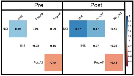 Pre and post correlation coefficients for the NCI, IINS and PANAS-C instruments. Non-significant correlation values given with white colouring. Blue indicates positive correlation; red indicates negative.