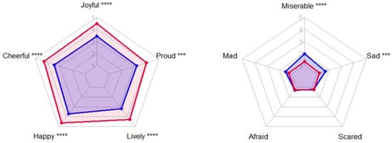 Means of the PANAS-C affect in the pre and post timing conditions. Pre-blue polygon, Post-red polygon. *** p ≤ 0.001; **** p ≤ 0.0001.