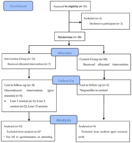 Figure 1 illustrates the flowchart of participants according to CONSORT diagram [30]. Of the 31 parents who were registered into the program, six of them were excluded, as they did not attend the introductory session. Finally, 25 were eligible for the study (15 allocated to the intervention group and 10 to the control group). Baseline characteristics of the participants are shown in Table 1. There was no difference in the sociodemographic variables between the groups. The mean age of parents was 39.23 (SD 5.76) years in the intervention group and 37.43 (SD 4.83) years in the control group. According to national statistics, in Spain most women have children at 35 years of age. Taking into account that our study chose fathers and mothers of children between 2 and 5 years old, the age of the participants is in line with national standards [31]. In both groups, most of the participants were female (N = 11, 84.6% Intervention group; N = 6, 60% Control group). In a parenting intervention systematic review indicated that female representation was over 90% in all the studies, so our results included more fathers that usual [15]. In both groups, participants were mostly married or lived as a couple. In addition, the participants generally had a high level of education since approximately half had a university degree. Most of the participants from the intervention group were Spanish (N = 7, 53.8%), the rest were from a variety of countries. On the contrary, in the control group there were more participants of foreign origin than national ones, being 40% (n = 4) Spanish, 40% (n = 4) African and 20% (n = 2) South American. According to the census of the territory where the study was carried out, 10.7% of the population has a migrant origin.