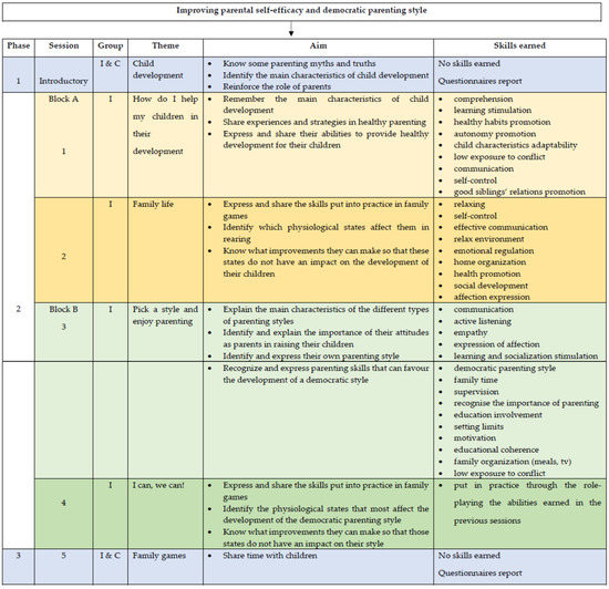 The intervention consisted of six 2-h group sessions held once a week. The sessions were led by a Registered Nurse trained in leading small groups and parenting. The sessions were conducted in small groups of 8–10 participants. Each session involved three different phases given the theoretical grounding of the study based on Bandura’s theory of self-efficacy [22,23], positive parenting following the Recommendation Rec of the European Committee of Ministers [29] and parenting styles [24,25]. The program focused on building parental self-efficacy through experiential activities related to child development, lifestyles (diet, exercise, and screen view) and family games. The nurse had a guiding role in each session where parents expressed their experiences in parenting and developed skills to promote healthy lifestyles.