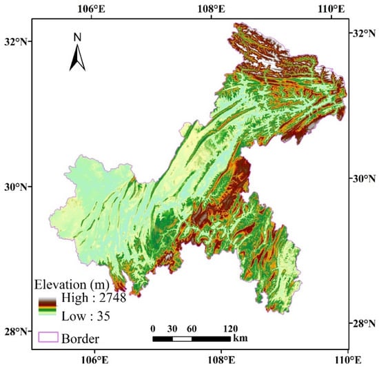 The city of Chongqing (28°10′ N~32°13′ N, 105°11′ E~110°11′ E) is located in the southwest of inland China (Figure 1) and is the sole municipality in central and western China. It stretches over 470 km from east to west and 450 km from north to south, covering an area of 82,400 square kilometers. The terrain of Chongqing decreases from north and south in the direction of the Yangtze River valley; the area is mainly covered by mountains and hills, also known as the “Mountain City”. Chongqing is located in the Subtropical Zone, with abundant precipitation, four distinct seasons, and a high annual relative humidity. Driven by China’s reform and opening up, urbanization in Chongqing is rapid [46], with a rate above 81.04% in 2017 [47]. The gross domestic product in 2019 amounted to 236.06 billion RMB. The surge of the urban population and the rapid economic development result in an increased land development [48], with conflicts between humans and the ecological environment becoming increasingly prominent [49], resulting in a continuous deterioration of ecosystems [50].