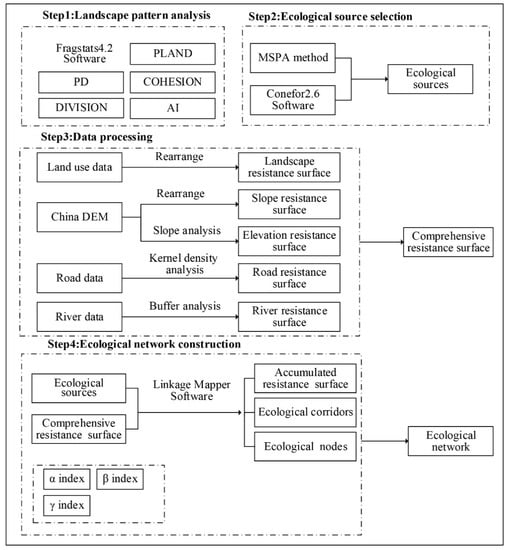 The study was divided into four steps (Figure 2). First, based on the landscape pattern analysis method, we used the Fragstats4.2 software (Oregon State University, Corvallis, OR, USA) to calculate the index values of PLAND (Percentage of Landscape), PD (Patch Density), COHESION (Patch Cohesion Index), DIVISION (Landscape Division Index), and AI (Aggregation Index) in Chongqing to analyze the evolution process of land use in Chongqing from 2005 to 2015. Second, using land use data from 2015, applying the MSPA method and the Conefor2.6 software (Jenness Enterprises, Flagstaff, AZ, USA), the ecological sources of Chongqing were selected. Then, based on available land use data, DEM data, road data, and river data, the appropriate GIS method was applied to obtain the resistance value, determine the landscape resistance surface, and generate the comprehensive resistance surface with reference to previous studies and specific conditions in Chongqing. Finally, we used the Linkage Mapper software to input the obtained ecological source data and the comprehensive resistance surface data to generate the ecological corridor and the accumulated resistance surface. By overlaying ecological sources, ecological corridors, and ecological nodes, Chongqing’s ecological network was finally constructed. According to the number of ecological corridors and nodes, the ecological network was evaluated and analyzed using the α index, β index, and γ index.