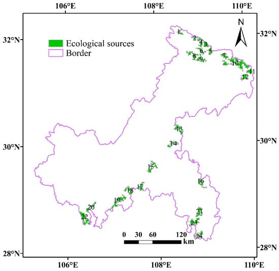 We selected 24 core patches with high connectivity as ecological sources. These patches not only have large area but can also protect the biodiversity and strengthen the landscape connectivity. The IIC value, the PC value, and dPC value of the 24 ecological sources were calculated according to Equations (1)–(3); the total area was 2961 km2, accounting for 68.90% of the total foreground area. The largest ecological source was source No. 10, with an area of 447 km2. The IIC and PC values were also the largest, indicating that the connectivity between them and other ecological sources is the strongest and plays a key role in the ecological process.