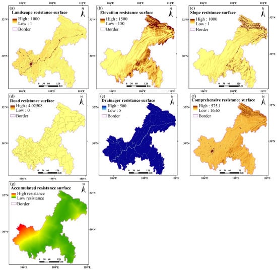 Landscape resistance surface (a), elevation resistance surface (b), slope resistance surface (c), road resistance surface (d), river resistance surface (e), comprehensive resistance surface (f), and cumulative resistance surface (g) obtained for Chongqing.