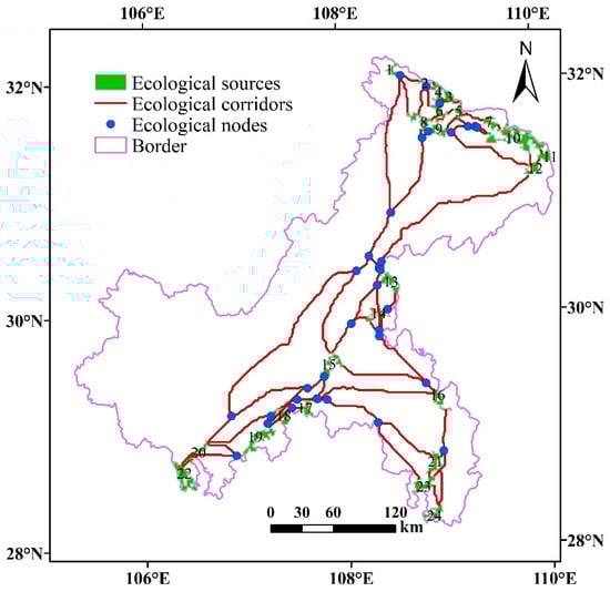 The important value of connectivity (dPC) of the core patch generated by MSPA shows that the greater the dPC values of the core patch, the greater the contribution of the patch to the overall landscape connectivity. The ecological network constructed in this paper should not only play a macro-role in maintaining regional ecological security, but also guide the layout of land use in ecological construction. Overall, we obtained 24 source plots (Figure 5).