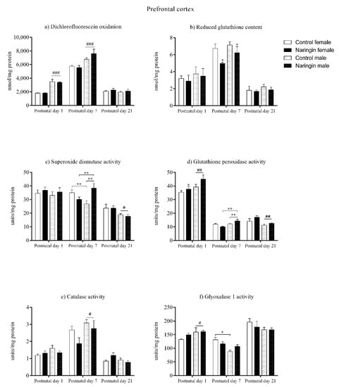 Therefore, considering the evidence suggesting that: (1) maternal high polyphenol intake can modify the redox status in fetal tissues, (2) naringin is a redox-active molecule able to modulate brain redox status, and (3) interventions during an organ’s critical window of development can induce persistent alterations, we hypothesized that maternal naringin supplementation during the third week of pregnancy can modify the offspring’s brain redox homeostasis during postnatal development. Here, the prefrontal cortex, hippocampus, striatum, and cerebellum were evaluated at three different postnatal ages up to postnatal day 21 in both sexes. By these means, we also aimed to assess if the alterations induced by prenatal naringin exposure could be sex-dependent and if they would persist along with postnatal development.