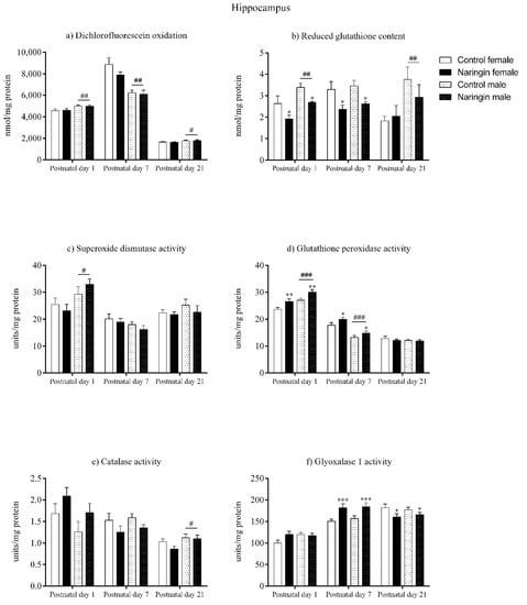 Effects of maternal naringin supplementation during the third week of gestation on the (a) dichlorofluorescein oxidation, (b) reduced glutathione content, (c) superoxide dismutase activity, (d) glutathione-peroxidase activity, (e) catalase activity, and (f) glyoxalase 1 activity in the offspring’s hippocampus on postnatal days 1, 7, and 21. Results are expressed as mean ± S.E.M. Control female n = 8, naringin female n = 8, control male n = 8, naringin male n = 6. * p < 0.05; ** p < 0.01; *** p < 0.001; # p < 0.05; ## p < 0.01; ### p < 0.001 (two-way ANOVA). Asterisks represent a main supplementation effect, and the hashes on bars represent a main sex effect. The asterisks on bars (single bracket) represent the significant comparisons by Sidak’s post-hoc test when interactions occurred.